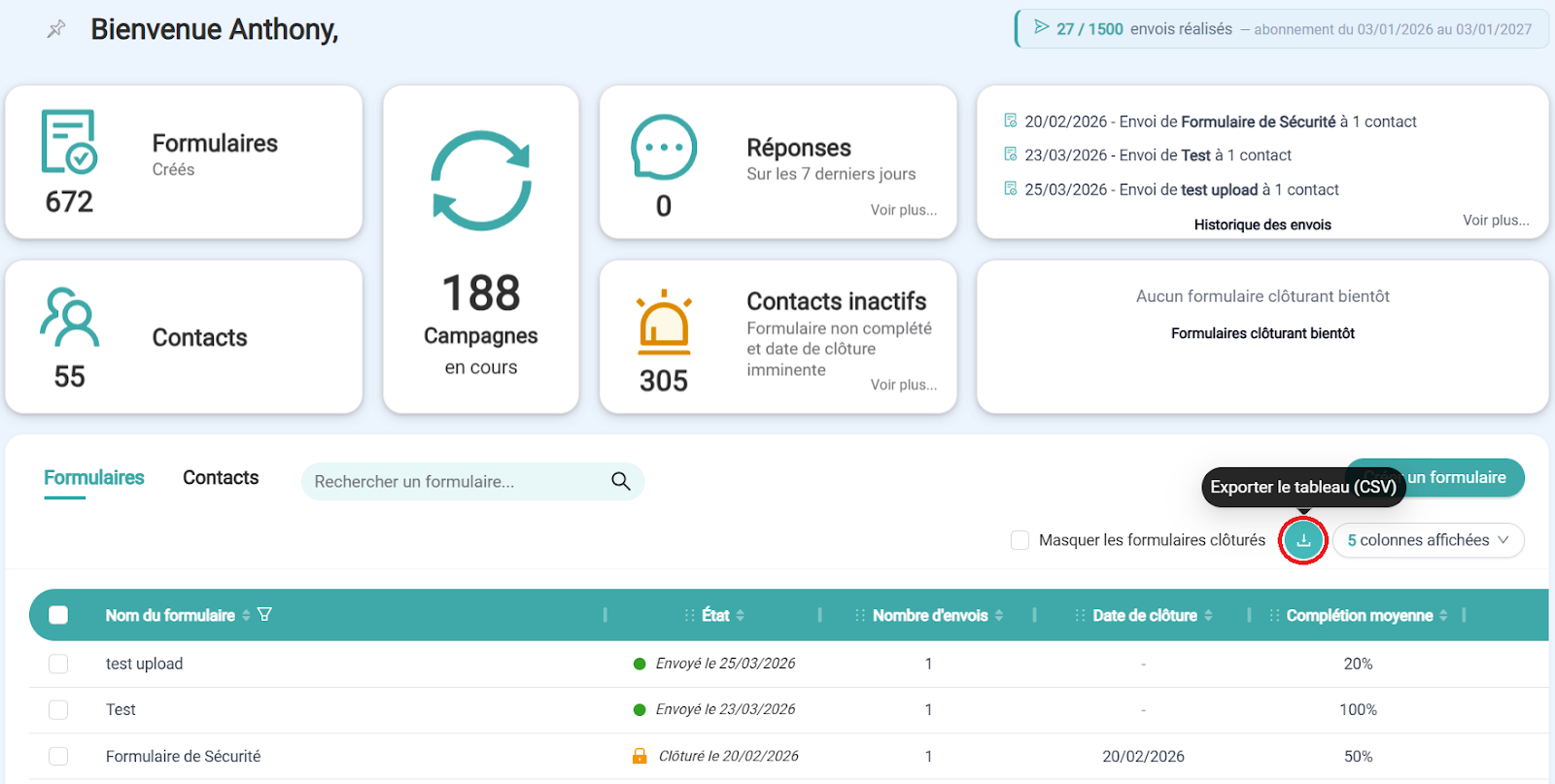 📥 Comment télécharger le tableau de bord des formulaires sous format CSV ?