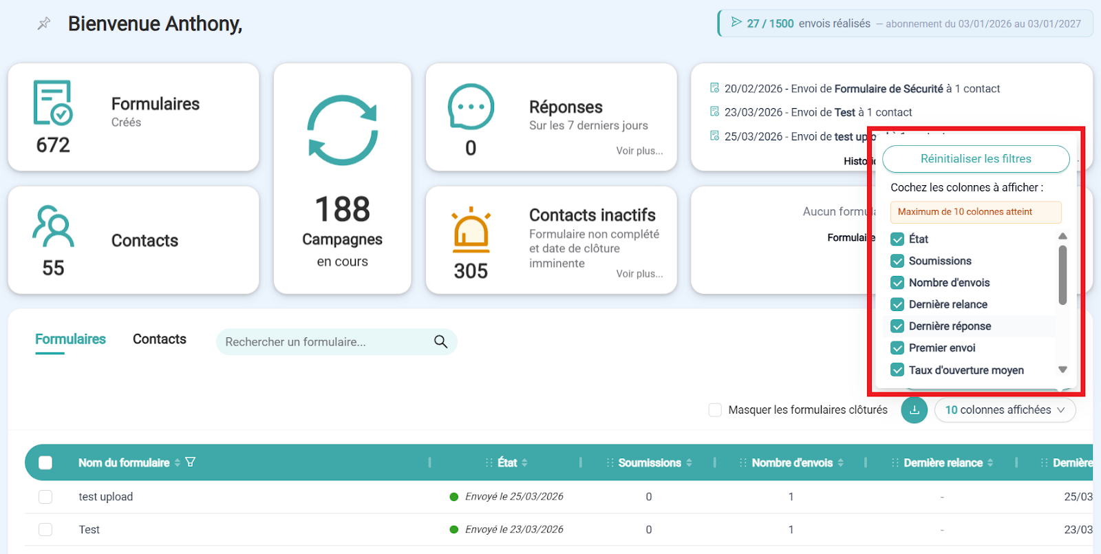 Vous avez la possibilité de personnaliser les colonnes qui apparaîtront dans le fichier téléchargé (jusqu’à 10 colonnes maximum).