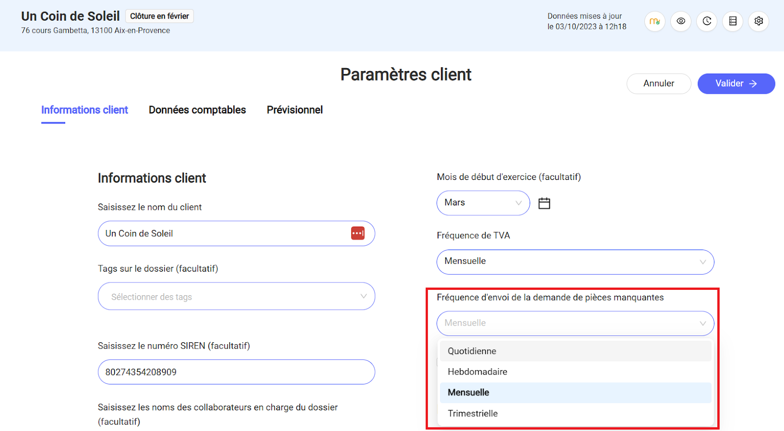 Vous avez la possibilité de configurer la fréquence d’envoi des demandes de pièces manquantes afin d’automatiser les relances auprès des clients et de faciliter la collecte des documents nécessaires à la tenue des dossiers.