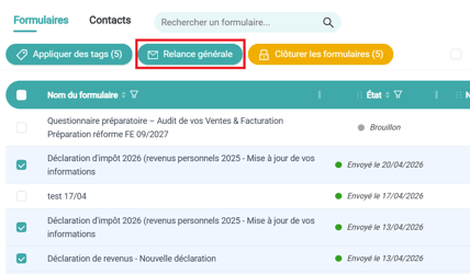 Il est désormais possible de relancer vos contacts sur plusieurs formulaires en une seule action, sans devoir programmer une relance formulaire par formulaire.