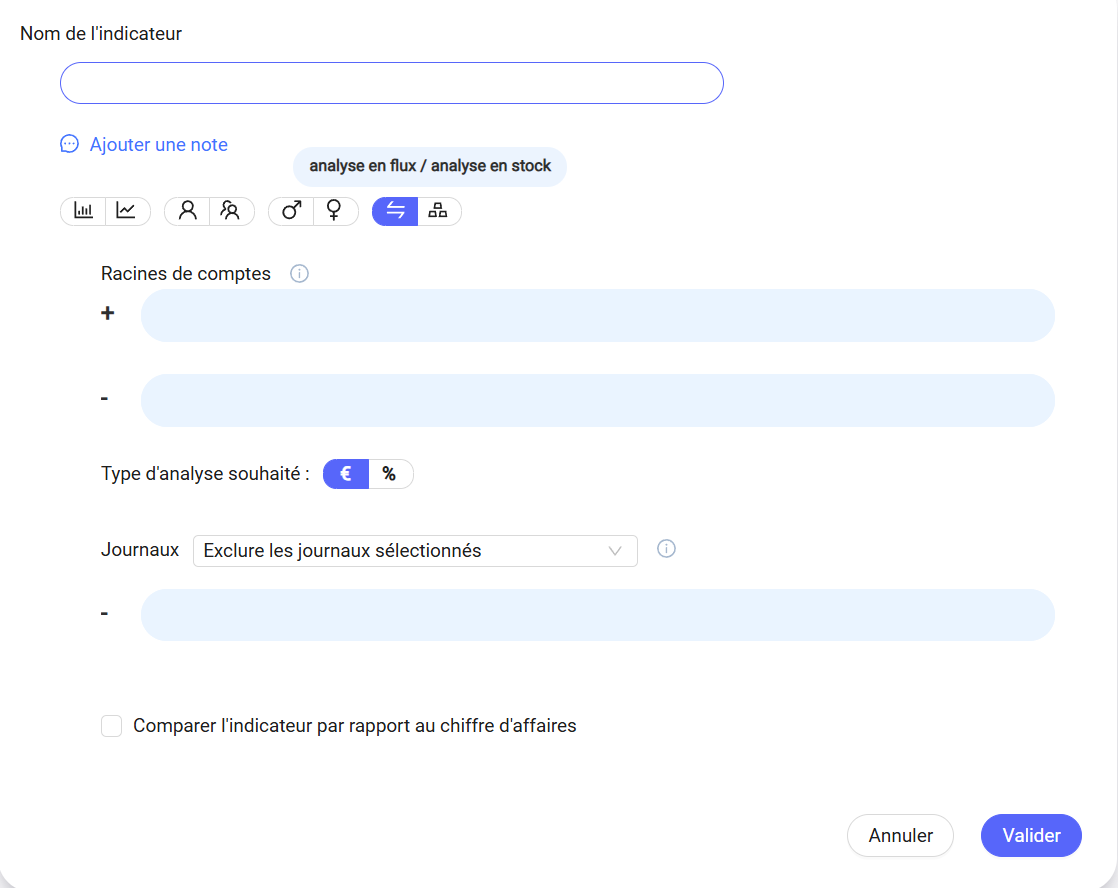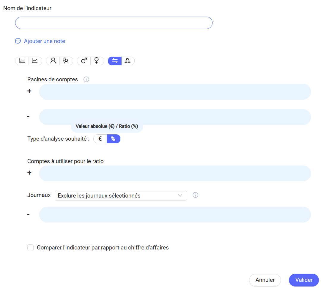 Renseignez ensuite les racines de comptes ainsi que les journaux à exclure si besoin. Pour que les données de votre indicateur soient comparées au chiffre d'affaires, cliquez sur la checkbox en bas du formulaire. Cliquez sur "valider" pour enregistrer votre indicateur.