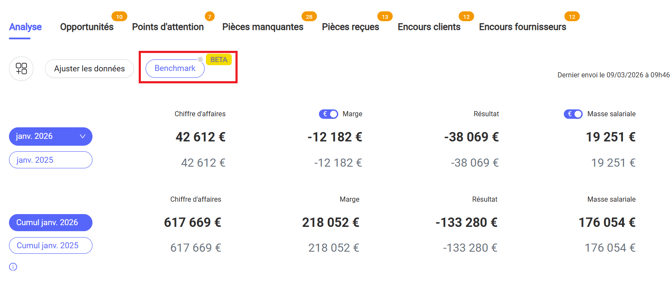 Pour activer l’option benchmark, il suffira d’accéder à un dossier client, d’aller dans l’onglet Analyse et de cliquer sur le bouton “Benchmark”.