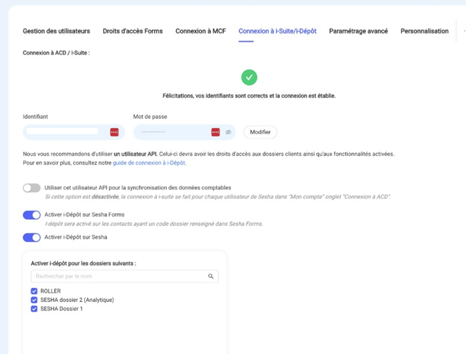 - Une fois vos identifiants renseignés, vous aurez la possibilité d'activer/désactiver i-Dépôt sur Sesha et sur Sesha Forms. Vous aurez également la possibilité de choisir les dossiers pour lesquels vous souhaitez activer i-Dépôt.