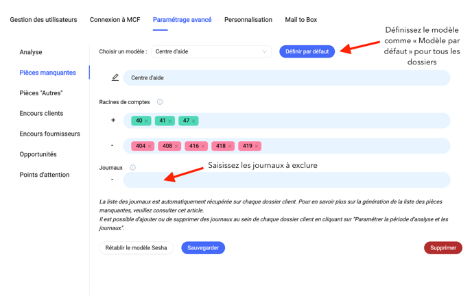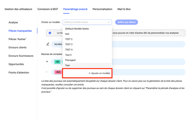Cliquez l'onglet "Paramétrage avancé" puis "Pièces manquantes".