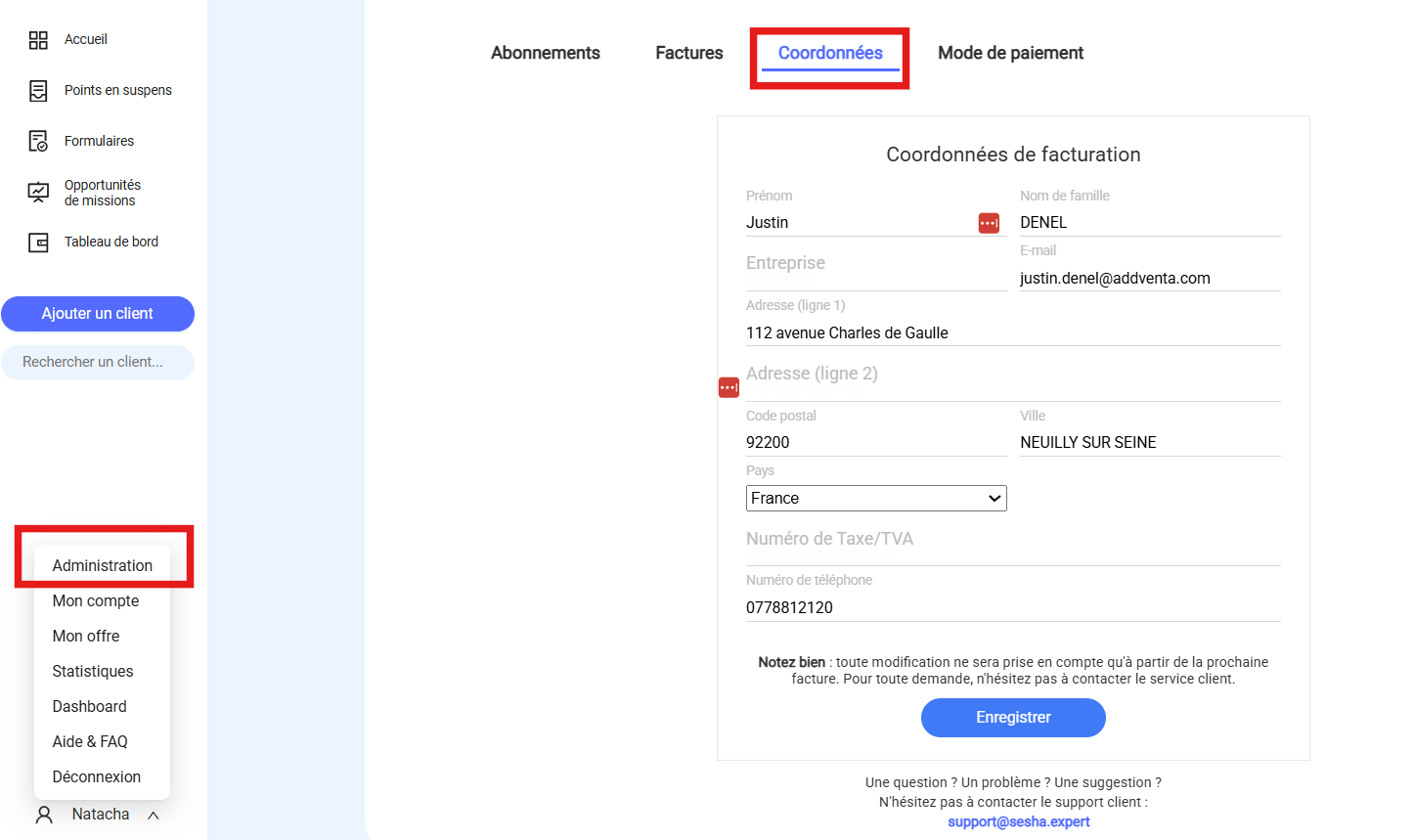 Voici comment modifier, mettre à jour vos coordonnées de facturation dans Sesha.