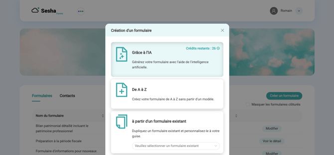 Dans Sesha Forms, cliquez sur "Créer un formulaire", puis sélectionnez l'option "Grâce à l'IA".