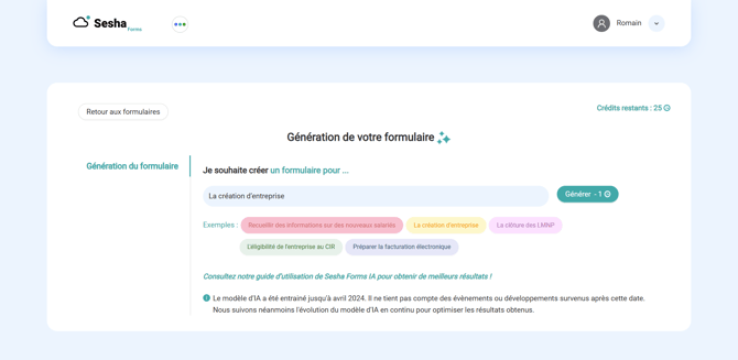- 🔄 Recommencer : retour en arrière pour générer un nouveau formulaire, la nouvelle génération vous coûtera à nouveau un crédit.