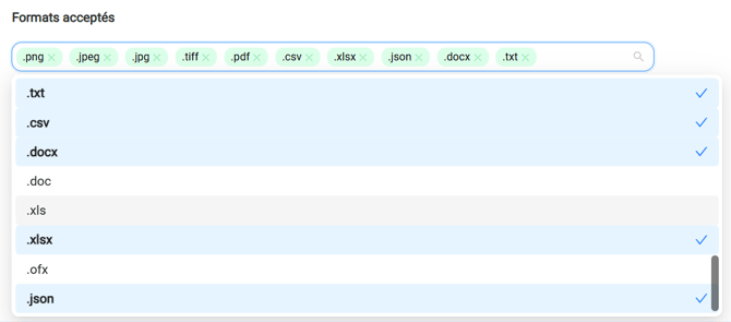 - ... et le format des fichiers acceptés pour la fonctionnalité Pièces manquantes et Sesha Forms en sélectionnant ou désélectionnant le format :