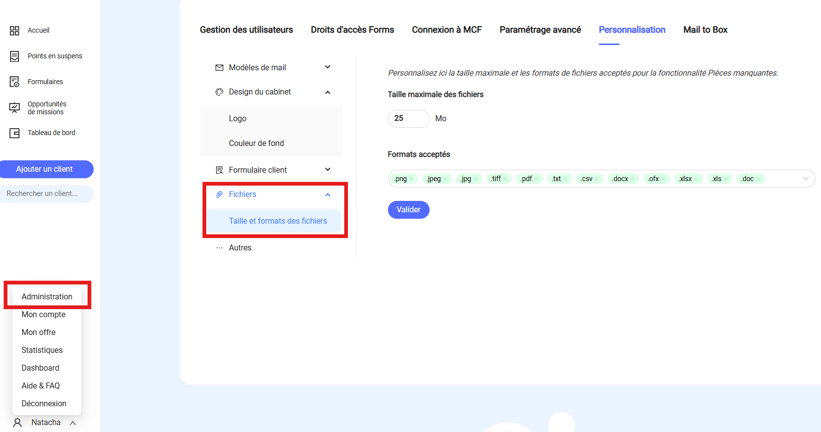 - Pour choisir la taille et le format des fichiers acceptés dans vos demandes de justificatifs, rendez-vous dans la partie Administration, onglet "Personnalisation".